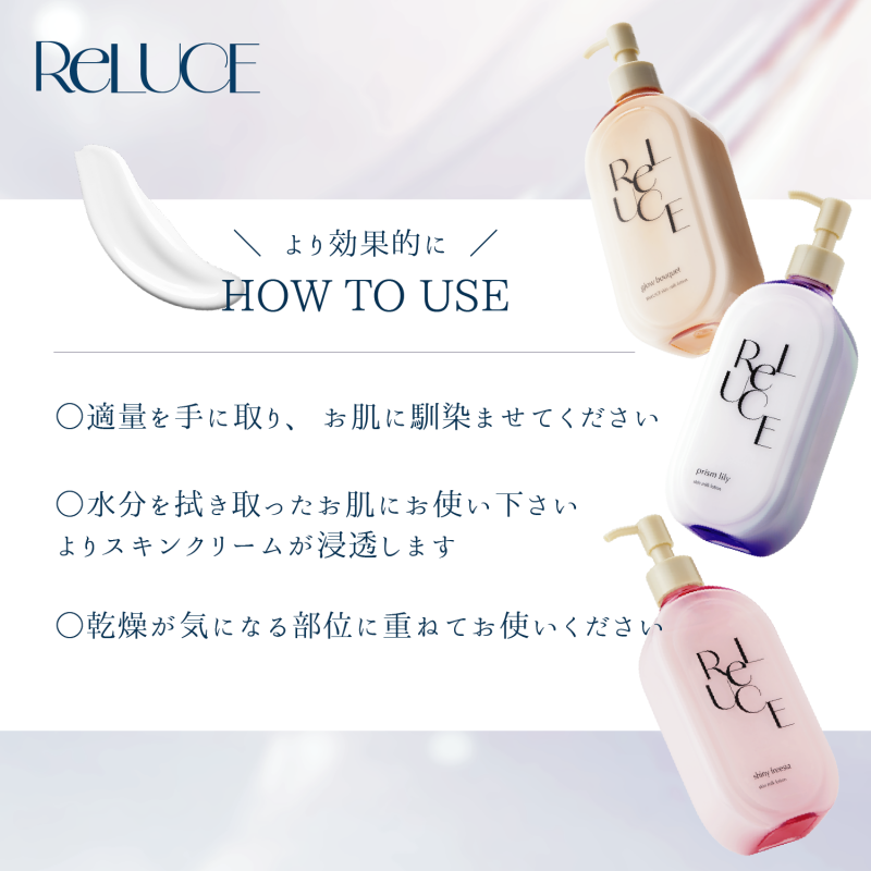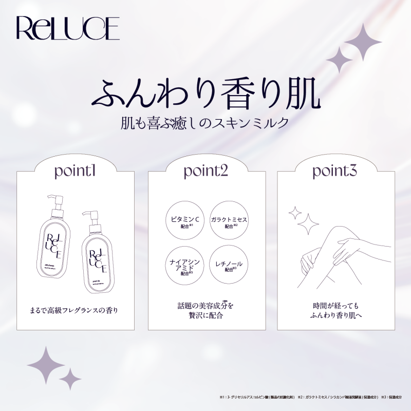 香水のような上品な香りで、キラキラとした気分に上がる全身ミルクローション。花束のようなハーバルフローラルの上品な香り。グルタチオン、3種のビタミンCを配合。乾燥肌ケアに優れたしっとり高保湿タイプ。