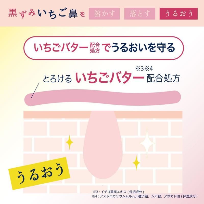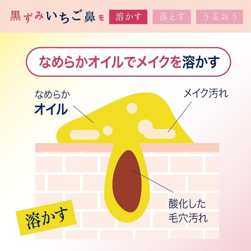 するんと落ちるクレンジングオイルで『脱!いちご鼻』。とろけるいちごバター処方とサリチル酸配合で、メイクや毛穴汚れをこすらずスッキリ落とす。濡れた手OK、マツエクOK。爽やかな摘みたていちごの香り。