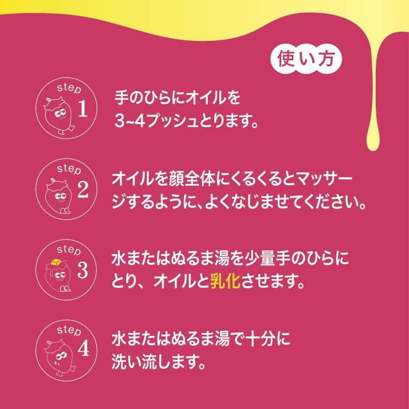 適量を手に取り、マッサージするようにメイクとよくなじませてください。メイクが浮き上がってきたら、水またはぬるま湯で充分に洗い流してください。
